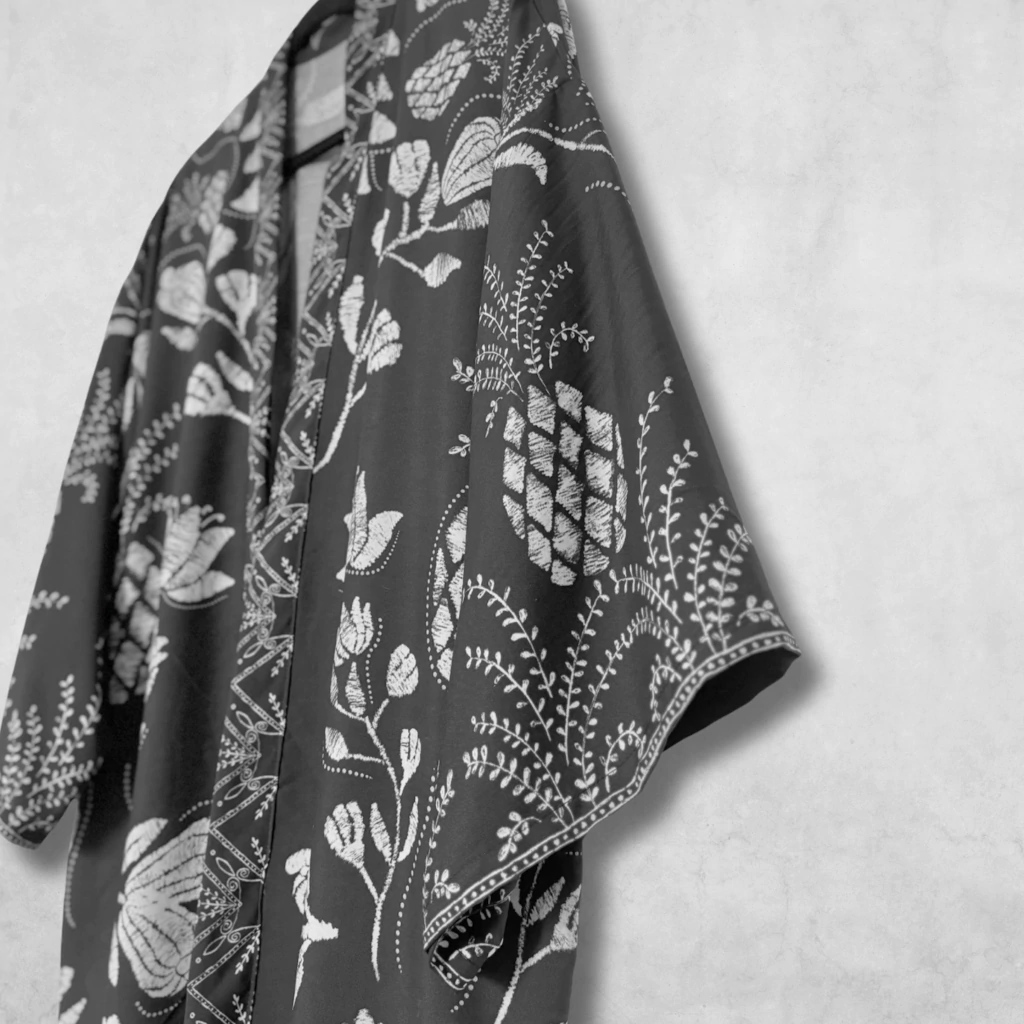QUIMONO/VESTIDO - Cerca de 90 cm de comprimento e mangas longas flare ocm cerca de 50cm de comprimento;